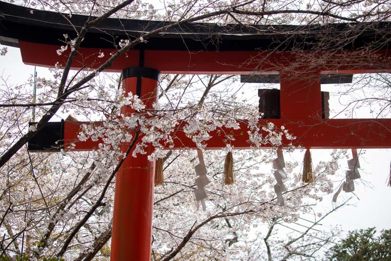 赤い鳥居にしめ縄やシデのヒラヒラ、そこに桜が合わさって素敵だわ♪